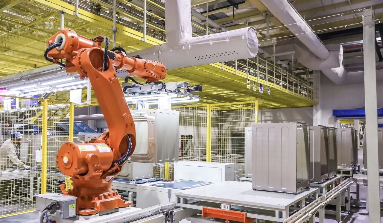 目前,我国正处于工业经济向创新型经济转型的关键阶段,以新型工业化为基础和载体,融合前沿科技创新技术,形成由实体经济支撑的新兴产业和未来产业,是打造新质生产力、建设现代化产业体系的关键。图为海尔青岛中德滚筒洗衣机互联工厂生产线。新华社发 王凯/摄