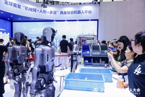 我国充分发挥在先进材料、半导体和人工智能等基础技术方面的优势,推动机器人、电信和新能源汽车等下游产业实现更好发展。图为2025世界机器人大会上展示的“机械臂+人形+多足”具身智能机器人平台。2025世界机器人大会组委会供图